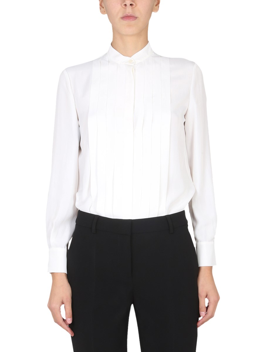 - COLLETTO ALLA COREANA- CHIUSURA FRONTALE CON BOTTONI NASCOSTA- PLISSETTATA SUL FRONTE- 74% ACETATO, 26% SETA- LA MODELLA È ALTA 180 CM E INDOSSA LA TAGLIA 40 IT
