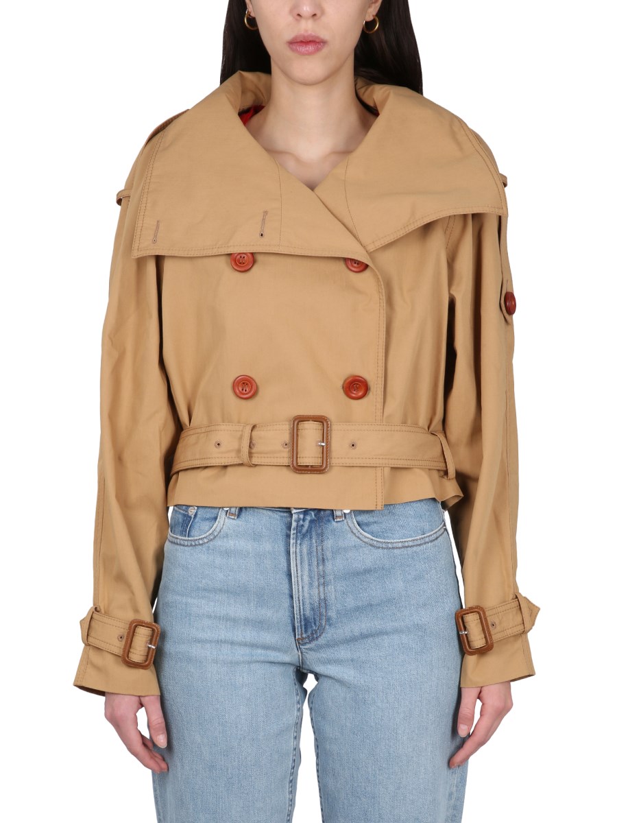 composizione- CHIUSURA CON BOTTONI - DOPPIOPETTO- CINTURA CON FIBBIA REGOLABILE - CROPPED FIT - 100% COTONE- LA MODELLA E' ALTA 180 CM E INDOSSA LA TAGLIA 36 FR