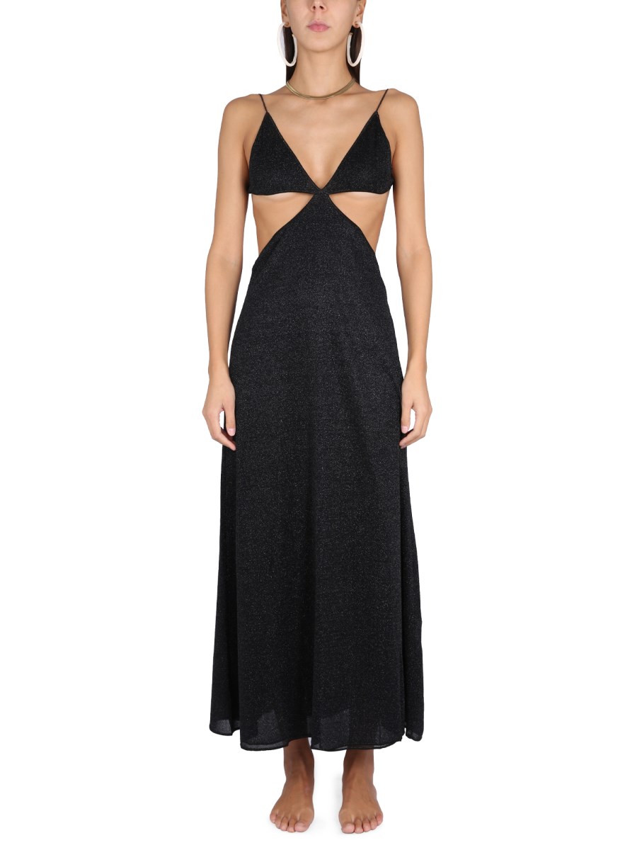 - SCOLLO A V- SPALLINI FINI- CHIUSURA CON LACCETTI- 64% POLIAMMIDE, 36% FIBRE METALLICHE- IL MODELLO È ALTO 185 CM E INDOSSA LA TAGLIA L