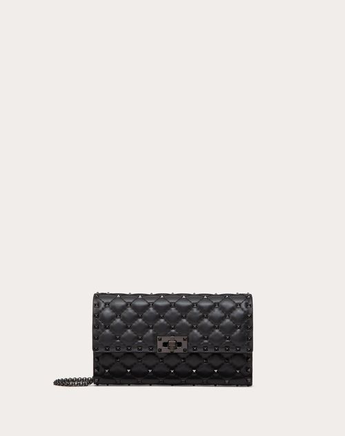 Borsa a tracolla con catena Valentino Garavani Rockstud Spike in morbida nappa d'agnello. Lavorazione trapuntata e decorata con piccole borchie tono su tono.La borsa può essere indossata a spalla/cross-body o a mano grazie alla catena amovibile.- Nappa trapuntata. Trama a rombi delineata da impunture tono su tono - Borchie e parti metalliche finitura tono su tono- Pattina con chiusura a girello- Fodera in nappa. Interno: Interno: tasca con zip e 8 vani portacarte- Dimensioni: W23xH13.5xD4.5 cm- Made in Italy