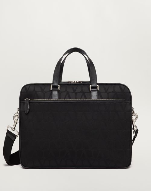 Borsa da lavoro Valentino Garavani in tessuto tecnico Toile Iconographe con dettagli in pelle.- Dettagli in pelle di vitello- Metallerie finitura palladio- Chiusura con zip- Esterno: tasca frontale con zip- Interno: tasca piatta con zip e due tasche a parete- Doppi manici in pelle- Tracolla regolabile e removibile in nastro- Altezza (luce) manico: 13 cm- Altezza (luce) tracolla: 55 cm- Logo Valentino Garavani- Dimensioni: W37 x H28 x D5 cm- Peso: 1,2 kg- Made in Italy