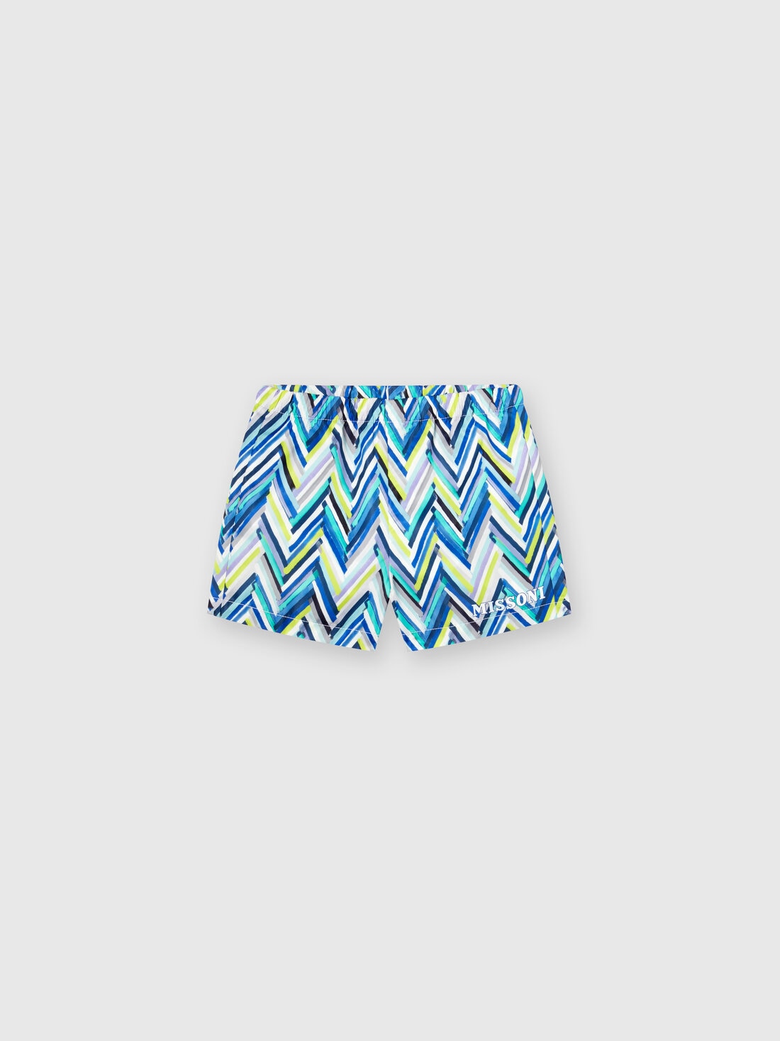 Comodità senza rinunciare alla moda: ecco i boxer mare corti da bambino proposti da Missoni. Interamente percorsi dallo chevron, il modello presenta vita con elastico e scritta logo a contrasto.