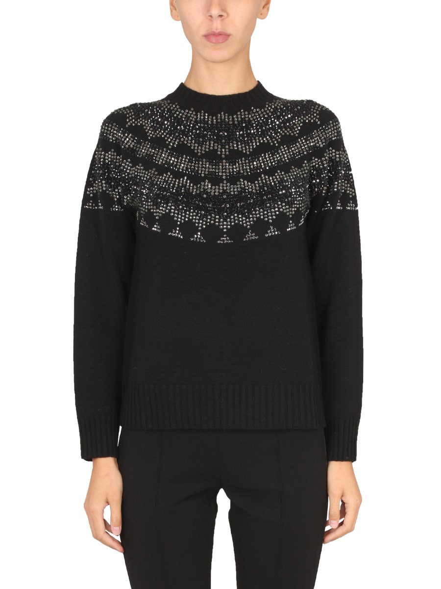 Il maglione a maniche lunghe di Max Mara è realizzato in 100% lana vergine e presenta un disegno folk di strass sul carré. I bordi a coste sono un complemento perfetto per il maglione. Il maglione ha un'aria casual e d'altri tempi, grazie alla comoda lana a coste. Il carré con strass bianchi e neri è bellissimo e si abbina perfettamente ai vostri jeans preferiti.