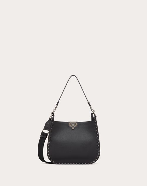 Borsa hobo Rockstud Valentino Garavani in vitello granato. La borsa può essere indossata a spalla o a mano grazie al manico in pelle e alla tracolla in nastro amovibili.- Borchie e parti metalliche finitura rutenio- Iconica chiusura a gancio- Manico in pelle amovibile- Tracolla in nastro regolabile e amovibile- Fodera in nappa. Interno: tasca piatta- Piedini protettivi- Altezza (luce) tracolla: min 41 cm - max 69 cm- Dimensioni: W20xH26xD10 cm- Made in Italy