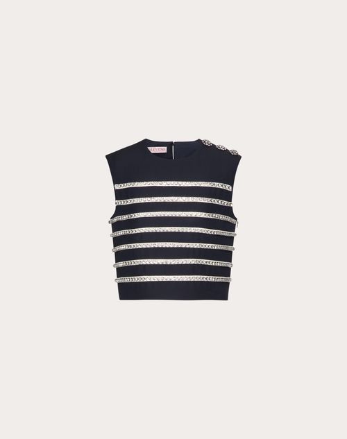 Top in Crepe Couture Ricamato - Chiusura posteriore con goccia e laterale con zip invisibile - Crepe Couture (65%Lana Vergine, 35%Seta) - Foderato in Habotai (100% Seta) - Lunghezza 45 cm da punto spalla per la taglia 40 IT - La modella è alta 176 cm e indossa una taglia 40 IT - Made in ItalyIl look è completato con una borsa Valentino Garavani Locò e scarpe Valentino Garavani VLogo Locker.