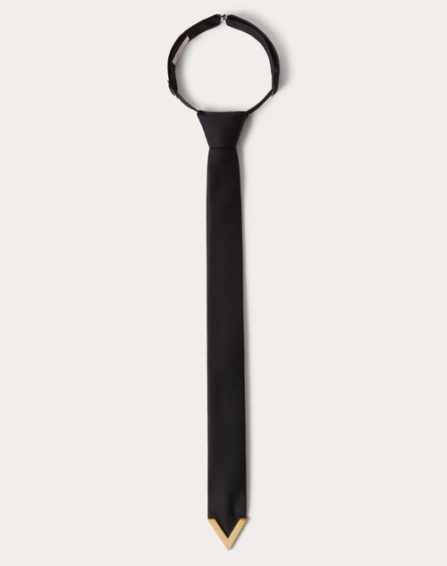 Cravatta Valentino Garavani Valentie in lana vergine e seta con applicazione V in metallo- Cravatta con nodo fisso, lunghezza collo regolabile con gancio: lunghezza minima cm 36 lunghezza massima cm 46- Composizione: 74% lana vergine, 26% seta- Dimensioni: 4,5 x44 cm- Lavare a Secco- Made in Italy