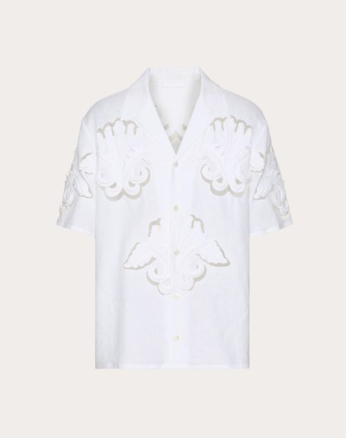 Camicia da bowling Valentino in lino con ricami Altorilievo- Boxy fit- Ricamo Altorilievo all over- Chiusura con bottoni- Composizione: 100% Lino- Lunghezza: 74 cm dall'attaccatura posteriore del collo in taglia 46 IT- Il modello è alto 187 cm e indossa una taglia 46 IT- Made in ItalyIl look è completato con scarpe Valentino Garavani VLogo Easyjog.