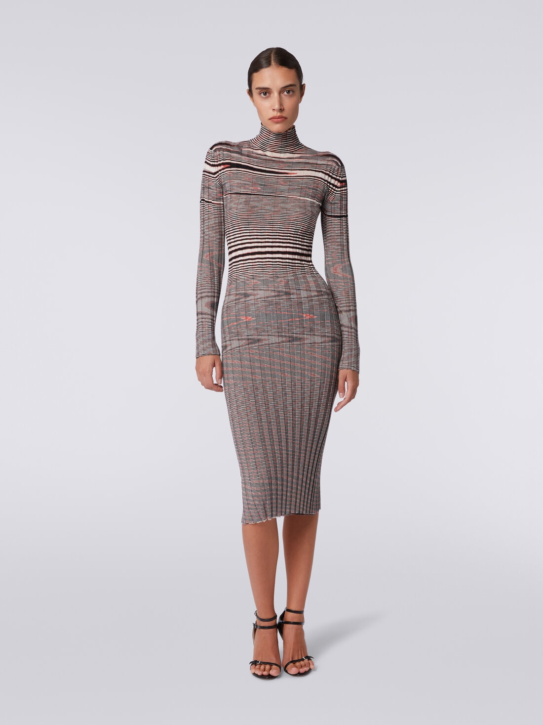 Un ricarcato blend di cachemire e seta informa l'abito longuette da donna a costine firmato Missoni. La pregiata maglia dal fit aderente, unitamente al motivo fiammato signature del brand, fanno di questo modello di abito a collo alto un vero e proprio must have della stagione.